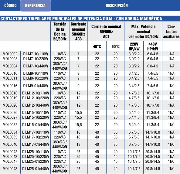 Versiones con control en DC de bajo consumo p/contactores auxiliares y contactores de 9A a 38A (AC3)Cuenta con una amplia gama de accesorios como enclavamiento mecánico, contactos auxiliares y una línea de contactores para bancos de condensado.